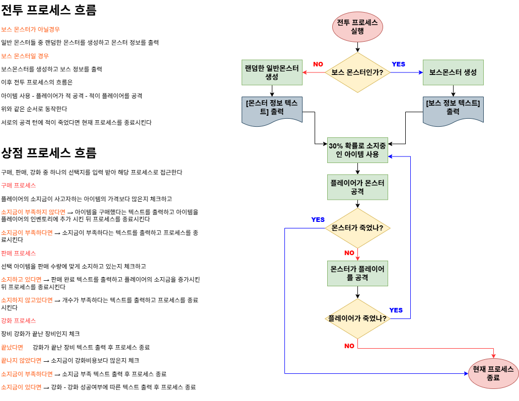 아래 순서도는 개발 중인 간단한 콘솔 텍스트 RPG 게임을 순서도로 표현한 것이다.